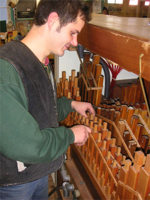 | Der "Friesenlümmel" war bis 10.Mai 2007 zur gründlichen Überholung in unserer Werkstatt. Dazu gehörten neben der Reparatur kleinerer und groesserer Schaeden auch die General-Reinigung der verschiedenen Orgelteile, die Stimmung der Orgel und ein komplet neuer Farbanstrich durch Kunstmaler Heinz Opitz / Waldkirch. | |||||||||||||||||||||||||||||||||||||||||||||||||||||||